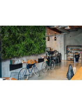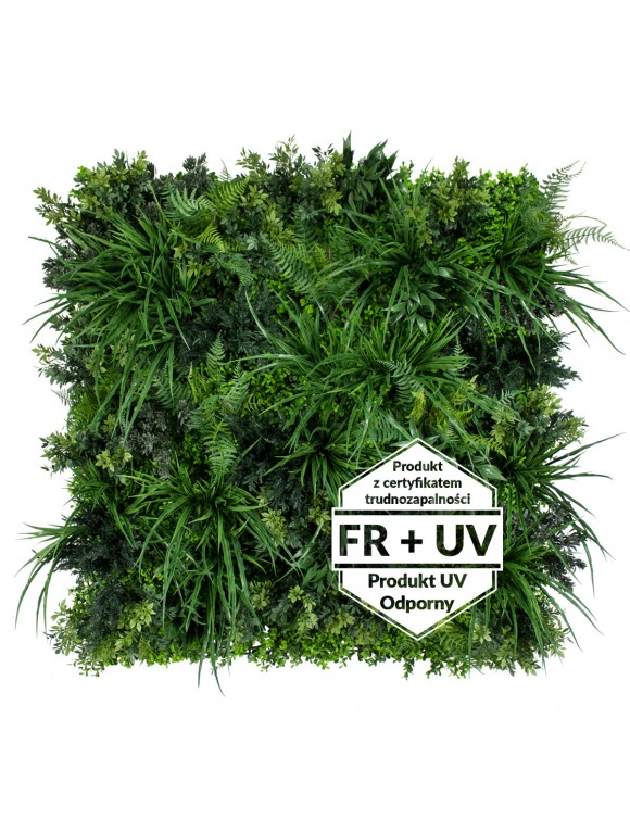 Wildgrass FR UV to połączenie zieleni opadających traw wraz z kępy paproci, lancetowatymi liśćmi protei, jagodą, krzewami chmielu i jemioły. Dekoracja ogrodowa wykonana z paneli Wildgrass, dzięki odporności na promieniowanie UV, nigdy nie straci na swojej jakości. Zielona ściana w ogrodzie nie wymaga żadnej pielęgnacji, podlewania ani nawożenia. Dodatkowo posiada atest trudnopalności, dzięki czemu może być stosowany w budynkach użyteczności publicznej.
