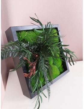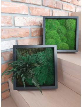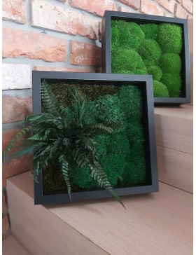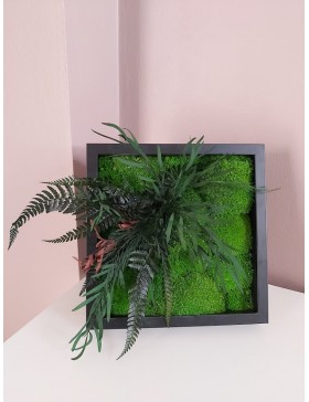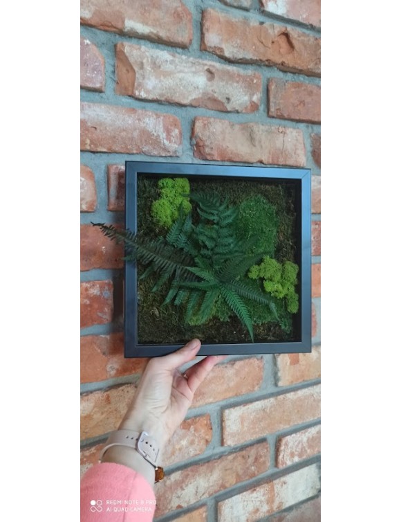 Ramka o wymiarach 27x27cm z wypełnieniem z mchu w różnorodnej kolorystyce. To oryginalny gadżet, który ożywi każdepomieszczenie i przyciągnie wzrok odwiedzających. Doskonale zaprezentuje się zarówno jako obraz na ścianie jak i ozdoba naszych mebli.