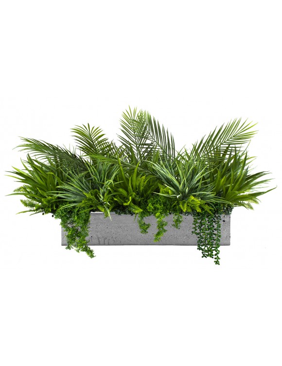 Coast Side to idealne rozwiązanie dla osób szukających bezobsługowej zieleni. To kompozycja składająca się z wielu gatunków sztucznej roślinności, tworzącychcałość. To połączenie liści palmowych, poprzetykane aloesami i kępami traw ozdobnych. Rośliny te mają około 50 centymetrów wysokości, dzięki czemu mogą być ustawione na różych wysokościach. Całość otoczona jest wiszącymi koralami senecio oraz mchami, które będą opadały na ścianki wybranej przez Ciebie donicy. Każdy wkład jest wykonywany ręcznie na indywidualne zamówienie. Wybrana kompozycja świetnie wpasuje się w każdą przestrzeń i co najważniejsze nie wymaga żadnej pielęgnacji. Wkłady do donic na wymiar dostępne są w wielu wariantach i typach. Zapoznaj się z naszą ofertą i wybierz wariant idealny dla Ciebie.