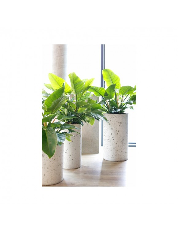 Donica z betonu architektonicznego w kształcie walca. Naturalna i subtelna w swojej prostocie pięknie wyeksponuje roślinność w ogrodzie i na tarasie.