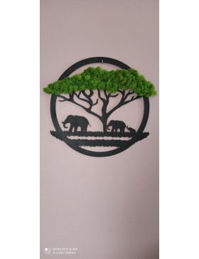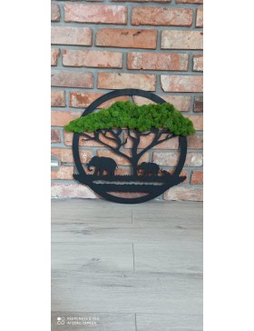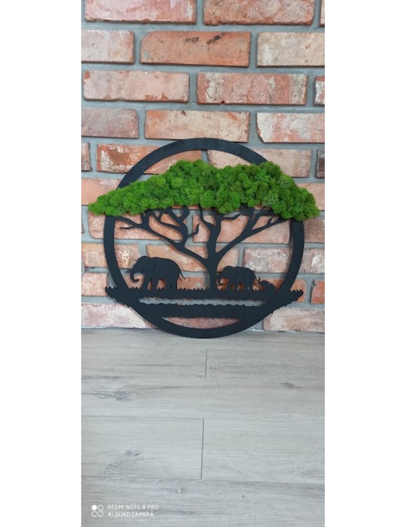 Obraz słonie z chrobotkiem, średnica 50cm. To oryginalny gadżet, który ożywi każde pomieszczenie i przyciągnie wzrok odwiedzających. Doskonale zaprezentuje się