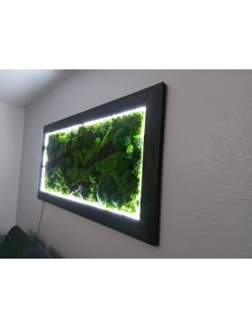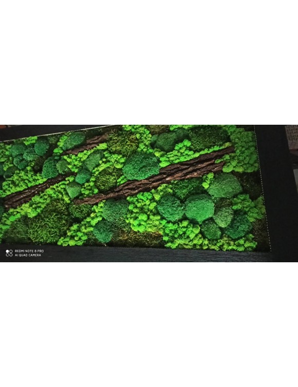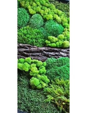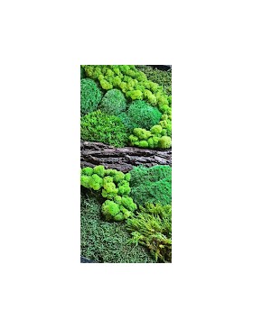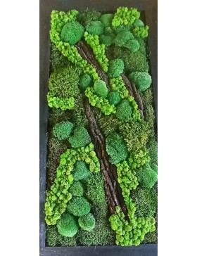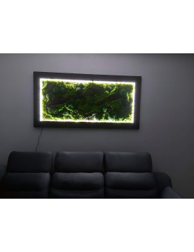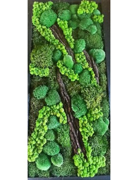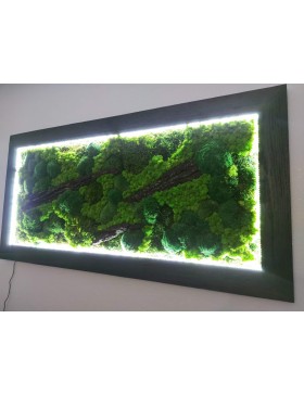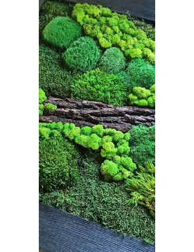 Obraz z mchów mieszanych z piękną stabilizowaną korą w czarnej drewnianej ramie o wymiarze 160x80cm. Istnieje możliwość zamówienie obrazu z oświetleniem led. To oryginalny gadżet, który ożywi każde pomieszczenie i przyciągnie wzrok odwiedzających. Doskonale zaprezentuje się jako obraz na ścianie. Obrazy z mchów to idealna dekoracja do łazienki, salonu, przedpokoju czy biura.