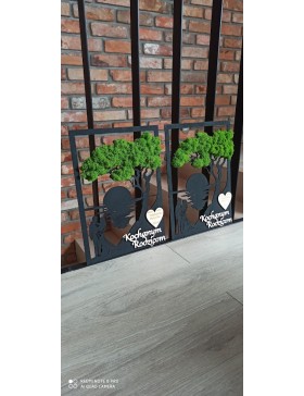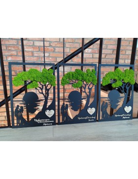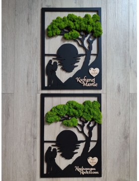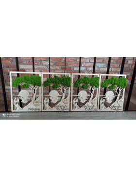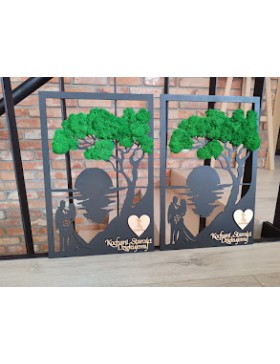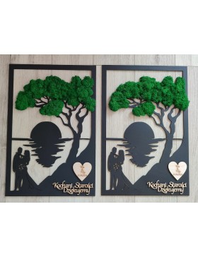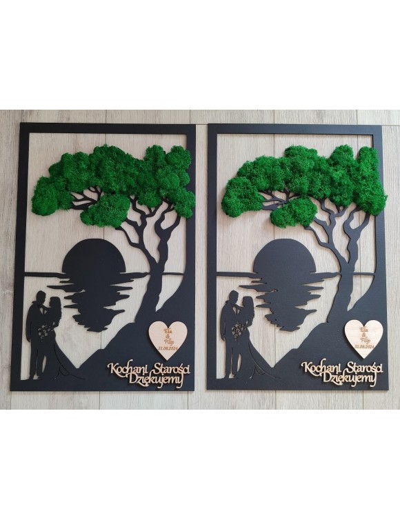Drzewko z Parą Młodą z pięknym zielonym chrobotkiem. Piękny, niepowtarzalny prezent, podziękowanie dla Rodziców, Dziadków, Świadków. Dedykacja dowolna.To oryginalny gadżet, który ożywi każde pomieszczenie i przyciągnie wzrok odwiedzających. Doskonale zaprezentuje się zarówno jako obraz na ścianie jak i ozdoba naszych mebli.