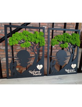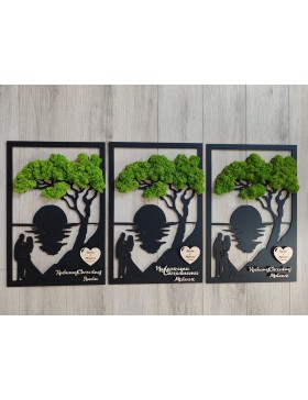 Drzewko z Parą Młodą z pięknym zielonym chrobotkiem. Piękny, niepowtarzalny prezent, podziękowanie dla Rodziców, Dziadków, Świadków. Dedykacja dowolna.To oryginalny gadżet, który ożywi każde pomieszczenie i przyciągnie wzrok odwiedzających. Doskonale zaprezentuje się zarówno jako obraz na ścianie jak i ozdoba naszych mebli.