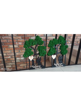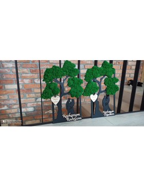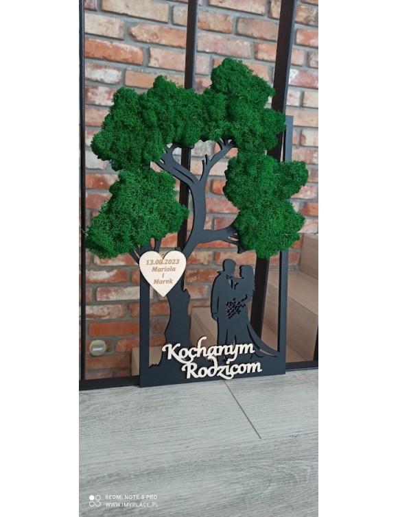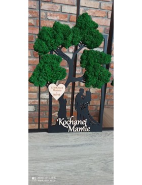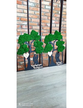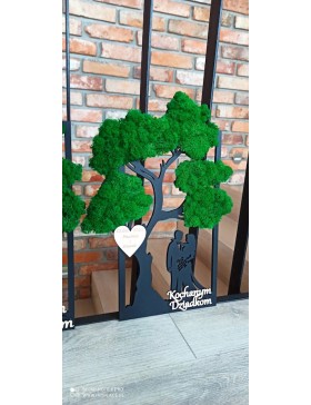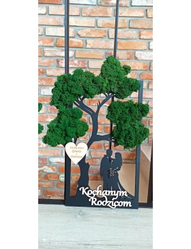 Drzewko z Parą Młodą z pięknym zielonym chrobotkiem. Piękny, niepowtarzalny prezent, podziękowanie dla Rodziców, Dziadków, Świadków, Chrzestnych. Dedykacja dowolna.To oryginalny gadżet, który ożywi każde pomieszczenie i przyciągnie wzrok odwiedzających. Doskonale zaprezentuje się zarówno jako obraz na ścianie jak i ozdoba naszych mebli.