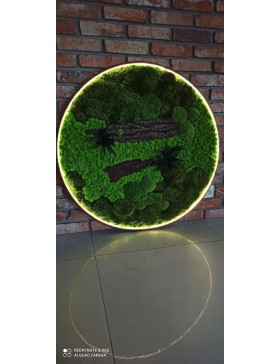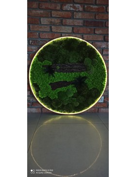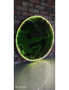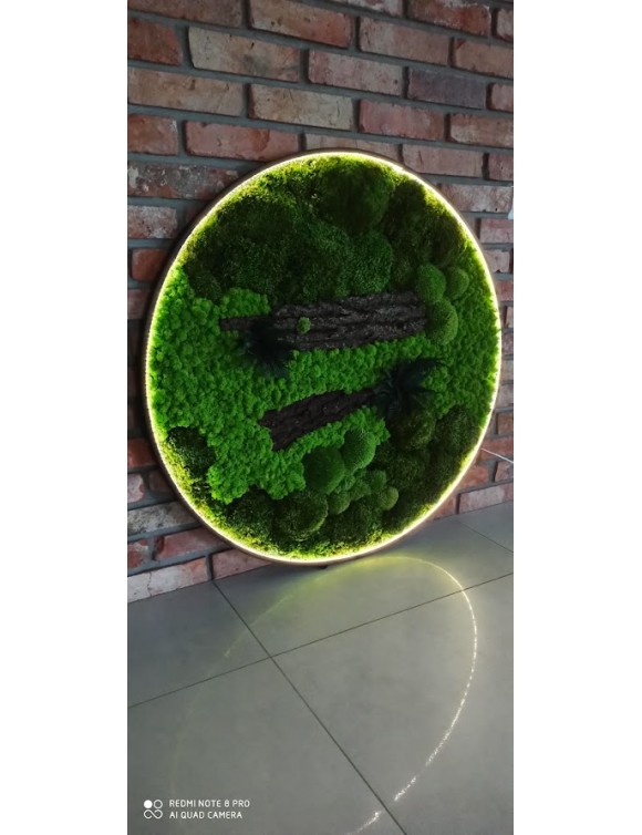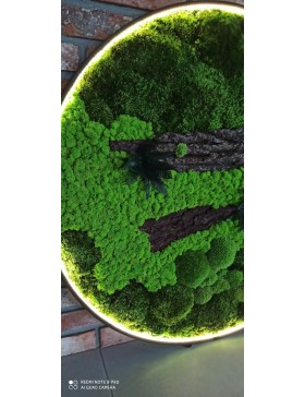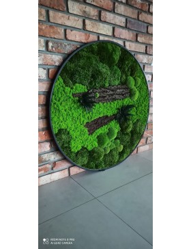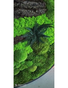 Panel okrągły z chrobotka, mchów, kory i paproci w metalowej ramie fi 120cm. To oryginalny gadżet, który ożywi każde pomieszczenie i przyciągnie wzrok odwiedzających. Doskonale zaprezentuje się zarówno jako obraz na ścianie jak i ozdoba naszych mebli.