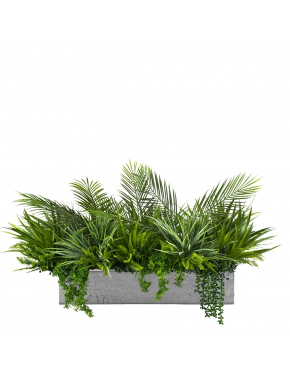 Jeśli marzysz o bezobsługowej zieleni w doniczkach, to idealnym rozwiązaniem będą wkłady do donicy Coast Side. To kompozycja składająca się z wielu gatunków sztucznej roślinności, które idealnie ze sobą współgrają. Znajdziesz między innymi charakterystyczne liście palmowe, poprzetykane aloesami i kępami traw ozdobnych. Rośliny te mają około 50 centymetrów wysokości, co sprawia, że idealnie odnajdą się zarówno ustawione na ziemi jak i na podwyższeniu w kwietnikach czy na półkach. Całość aranżacji otoczona jest wiszącymi koralami senecio oraz mchami, które pięknie i naturalnie opadają po ścianie Twojej wybranej doniczki. Każdy wkład jest wykonywany ręcznie na zamówienie na zadany wymiar, niezależnie od wielkości, kształtu czy głębokości naczynia. Wypełnienie zostanie dostosowane do Twoich potrzeb i przygotowane w taki sposób, byś po odbiorze mógł gotową kompozycję od razu obsadzić na swoje miejsce. Taka zieleń świetnie wpasuje się w każdą przestrzeń a dodatkowo nie wymaga żadnej pielęgnacji. Wkłady do donic na wymiar dostępne są w wielu wariantach i typach. Sprawdź na naszej stronie i wybierz najlepiej pasujący Ci zestaw roślin.