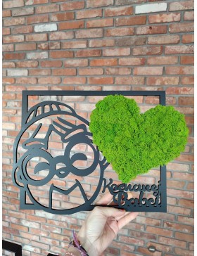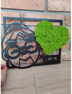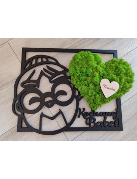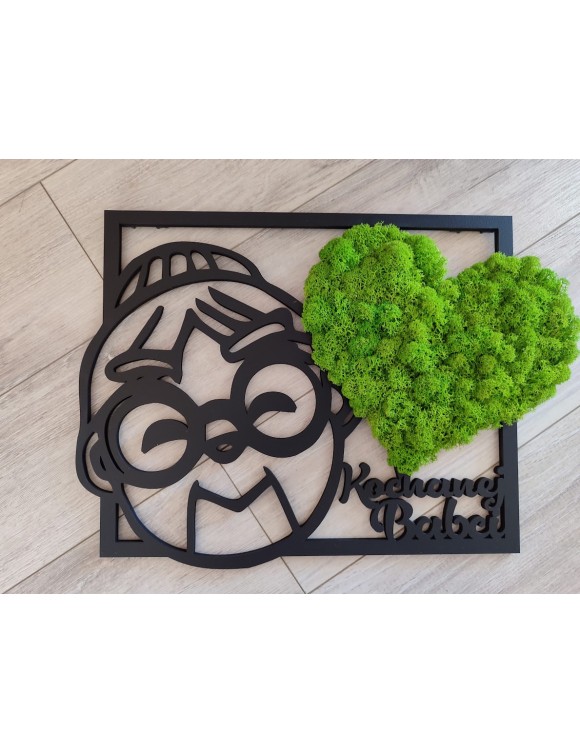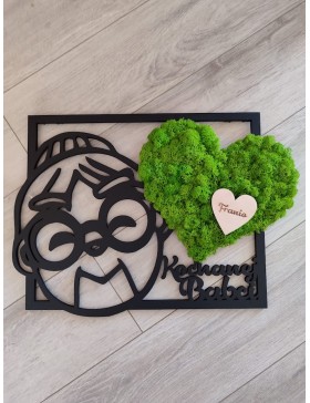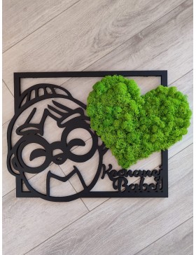 Obraz Babci z sercem wyklejonym pięknym chrobotkiem,. Niezwykły, oryginalny pomysł na prezent z Okazji Dnia Babci i dziadka. Doskonale zaprezentuje się zarówno jako obraz na ścianie jak i ozdoba naszych mebli.