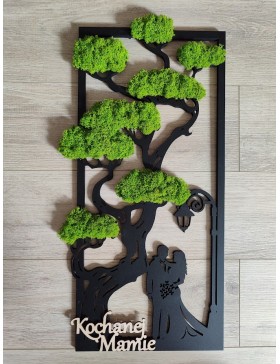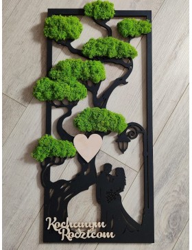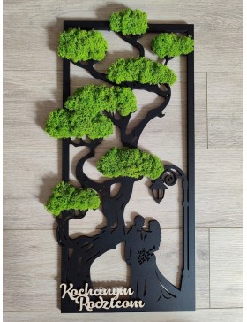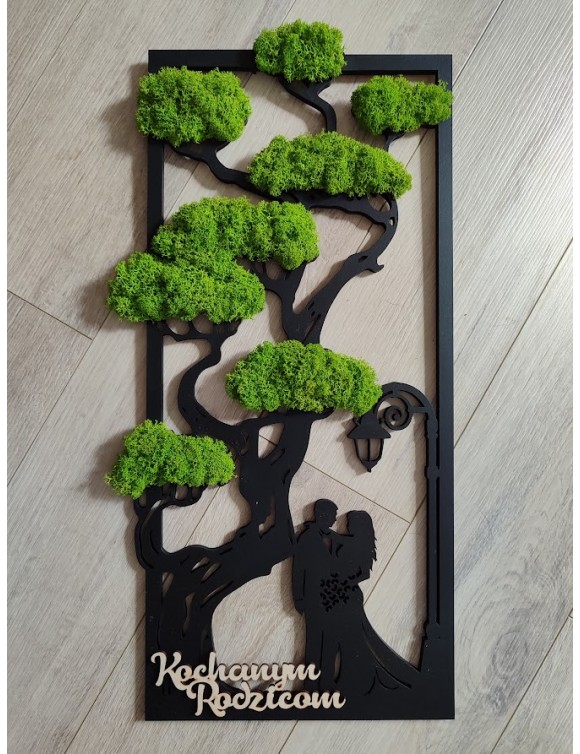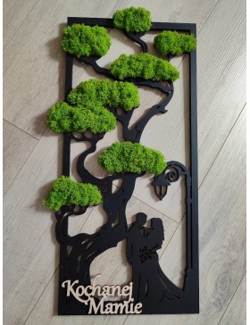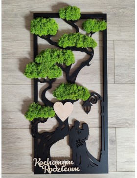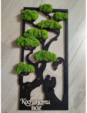 Drzewko z Parą Młodą z pięknym zielonym chrobotkiem. Piękny, niepowtarzalny prezent, podziękowanie dla Rodziców, Dziadków, Świadków. Dedykacja dowolna.To oryginalny gadżet, który ożywi każde pomieszczenie i przyciągnie wzrok odwiedzających. Doskonale zaprezentuje się zarówno jako obraz na ścianie jak i ozdoba naszych mebli.