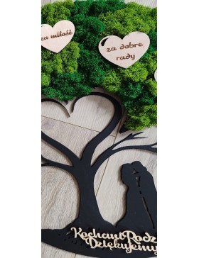 Drzewko z Parą Młodą z pięknym zielonym chrobotkiem. Piękny, niepowtarzalny prezent, podziękowanie dla Rodziców, Dziadków, Świadków. Dedykacja dowolna.To oryginalny gadżet, który ożywi każde pomieszczenie i przyciągnie wzrok odwiedzających. Doskonale zaprezentuje się zarówno jako obraz na ścianie jak i ozdoba naszych mebli.