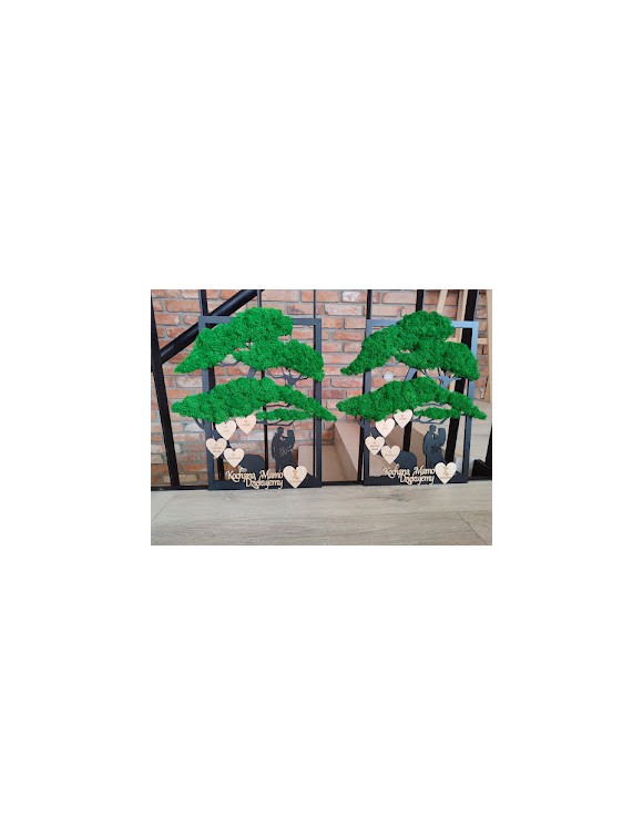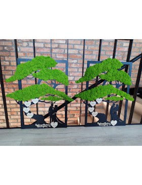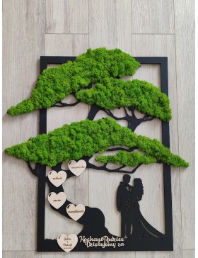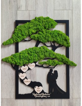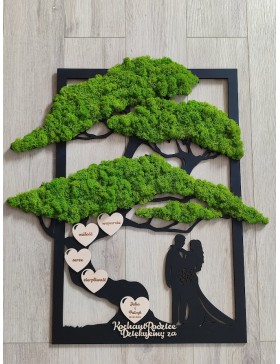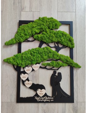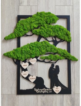 Drzewko z Parą Młodą z pięknym zielonym chrobotkiem. Piękny, niepowtarzalny prezent, podziękowanie dla Rodziców, Dziadków, Świadków. Dedykacja dowolna.To oryginalny gadżet, który ożywi każde pomieszczenie i przyciągnie wzrok odwiedzających. Doskonale zaprezentuje się zarówno jako obraz na ścianie jak i ozdoba naszych mebli.