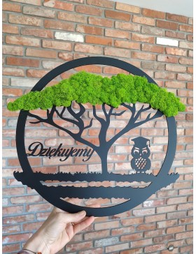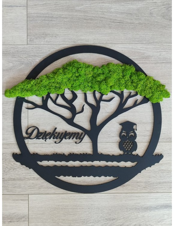 Drzewko z sową i pięknym zielonym chrobotkiem. Piękny, niepowtarzalny prezent, podziękowanie dla Nauczycieli. Dedykacja dowolna.To oryginalny gadżet, który ożywi każde pomieszczenie i przyciągnie wzrok odwiedzających. Doskonale zaprezentuje się zarówno jako obraz na ścianie jak i ozdoba naszych mebli.