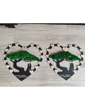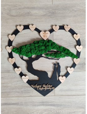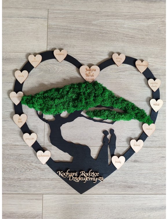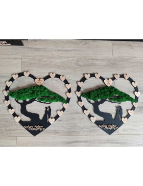 Drzewko z Parą Młodą z pięknym zielonym chrobotkiem. Piękny, niepowtarzalny prezent, podziękowanie dla Rodziców, Dziadków, Świadków. Dedykacja dowolna.To oryginalny gadżet, który ożywi każde pomieszczenie i przyciągnie wzrok odwiedzających. Doskonale zaprezentuje się zarówno jako obraz na ścianie jak i ozdoba naszych mebli.