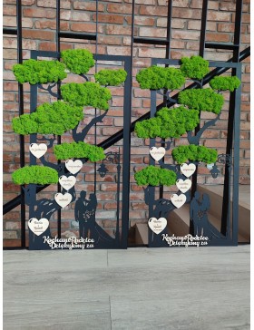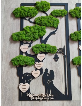 Drzewko z Parą Młodą z pięknym zielonym chrobotkiem. Piękny, niepowtarzalny prezent, podziękowanie dla Rodziców, Dziadków, Świadków. Dedykacja dowolna.To oryginalny gadżet, który ożywi każde pomieszczenie i przyciągnie wzrok odwiedzających. Doskonale zaprezentuje się zarówno jako obraz na ścianie jak i ozdoba naszych mebli.