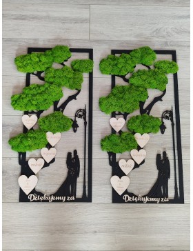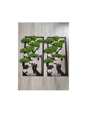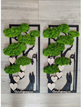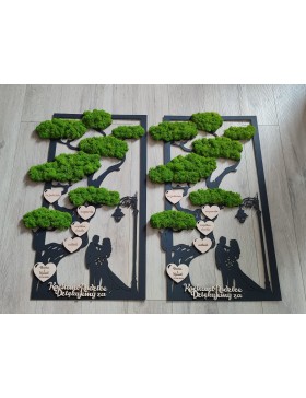 Drzewko z Parą Młodą z pięknym zielonym chrobotkiem. Piękny, niepowtarzalny prezent, podziękowanie dla Rodziców, Dziadków, Świadków. Dedykacja dowolna.To oryginalny gadżet, który ożywi każde pomieszczenie i przyciągnie wzrok odwiedzających. Doskonale zaprezentuje się zarówno jako obraz na ścianie jak i ozdoba naszych mebli.
