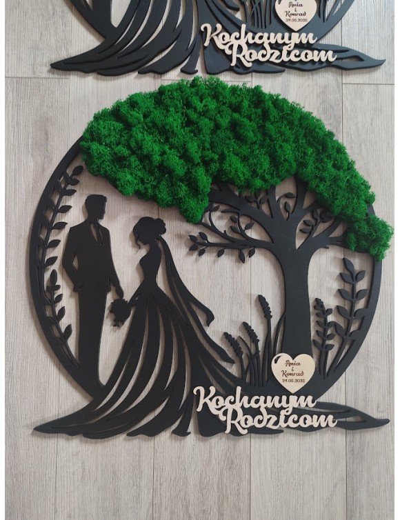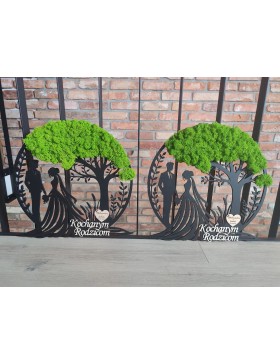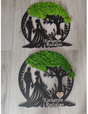 Drzewko z Parą Młodą z pięknym zielonym chrobotkiem. Piękny, niepowtarzalny prezent, podziękowanie dla Rodziców, Dziadków, Świadków. Dedykacja dowolna.To oryginalny gadżet, który ożywi każde pomieszczenie i przyciągnie wzrok odwiedzających. Doskonale zaprezentuje się zarówno jako obraz na ścianie jak i ozdoba naszych mebli.