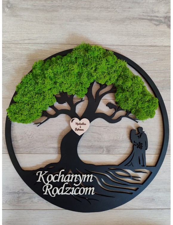 Drzewko z Parą Młodą z pięknym zielonym chrobotkiem. Piękny, niepowtarzalny prezent, podziękowanie dla Rodziców, Dziadków, Świadków. Dedykacja dowolna.To oryginalny gadżet, który ożywi każde pomieszczenie i przyciągnie wzrok odwiedzających. Doskonale zaprezentuje się zarówno jako obraz na ścianie jak i ozdoba naszych mebli.
