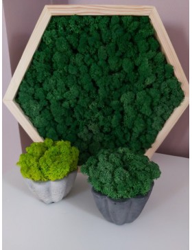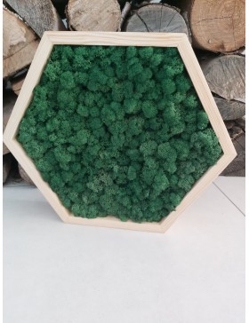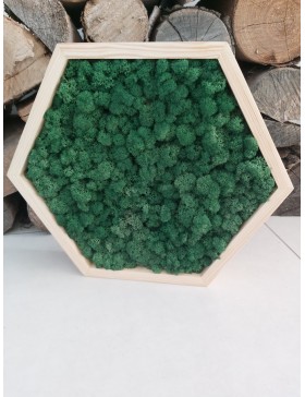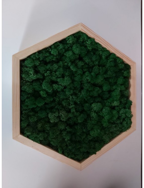 Ramka w kształcie heksagonu o wymiarach 34x30cm z wypełnieniem z mchu w różnorodnej kolorystyce: czerwony, seledynowy, niebieski, ciemnozielony i żółty. To oryginalny gadżet, który ożywi każde pomieszczenie i przyciągnie wzrok odwiedzających. Doskonale zaprezentuje się zarówno jako obraz na ścianie jak i ozdoba naszych mebli.